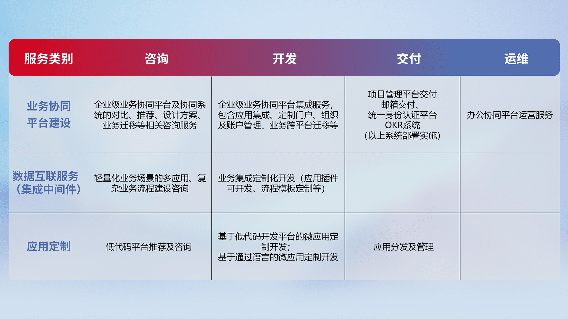 针对钉钉、、、企微、、IDaas等平台级产品提供产品的规划、、方案、、、、交付、、定制化开发等服务,,实现如统一协同办公、、、智能客户服务、、、混合会议管理、、、智能数据查询、、等业务场景,,,实现数字化转型。。