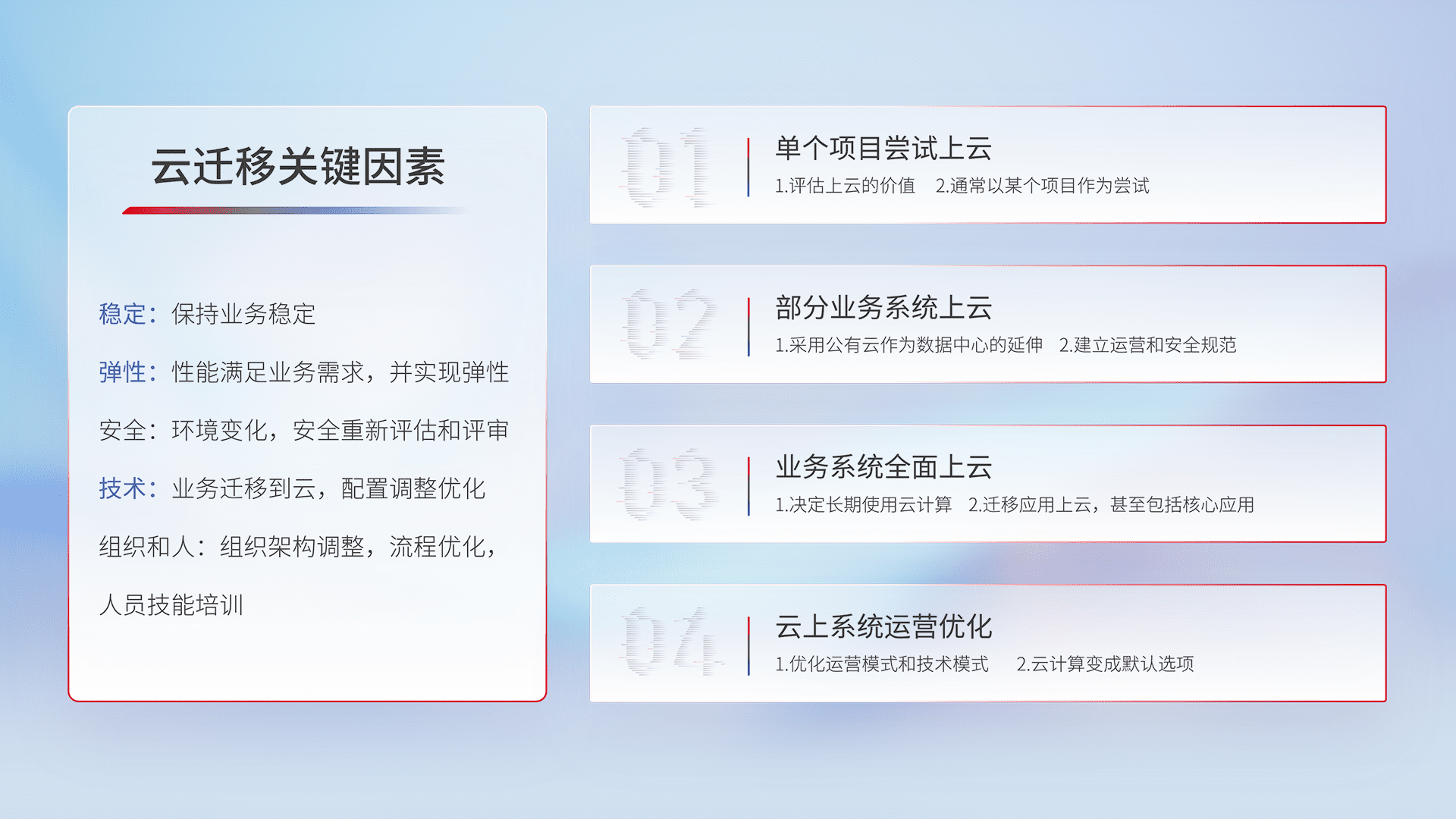 结合实际业务,,,,从规划设计、、、、云平台选型、、、云原生改造、、数据迁移、、、、集成交付,,迁移全过程为客户识别最佳上云路径,,,做好风险识别管理,,,,设计网络架构、、、、身份权限、、安全审计合规、、、、操作审计、、日志审计、、、监控告警策略、、、、多站点容灾设计等,,对云上基础设施进行整体规划,,提升IT治理水平,,,以满足弹性、、、高可用、、、高性能的需求。。。。