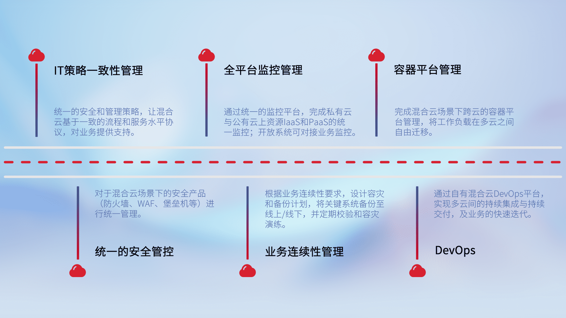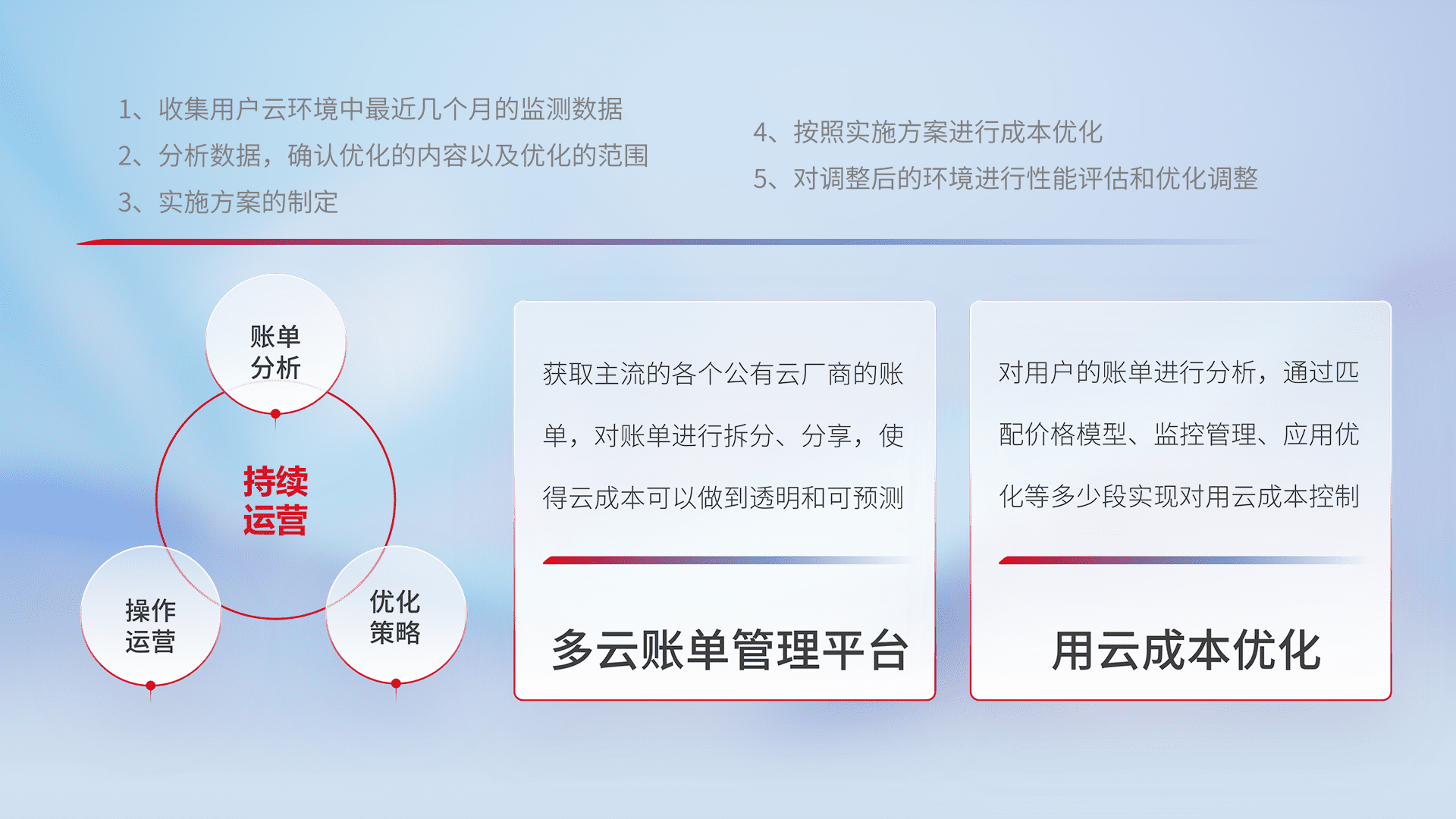 通过多云纳管,,,,以统一的资源数据模型把客户的云资源进行抽象和封装,,,进而实现对多云资源的统一操作,,,保障云资源管理的可靠性、、、、稳定性与可用性。。量身定制化运维内容,,,配置、、、开发运维、、、、补丁管理、、、备份、、、监控、、、、认证和访问管理、、审计和日常巡检等,,,,保障在用云过程中的可靠度,,,,稳定度以及高可用率。。。